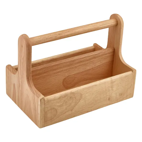 This Hevea wood table caddy is designed to hold cutlery, napkins, and condiments neatly on dining tables. Its solid wood construction and natural finish provide both functionality and elegance for hospitality and home settings.