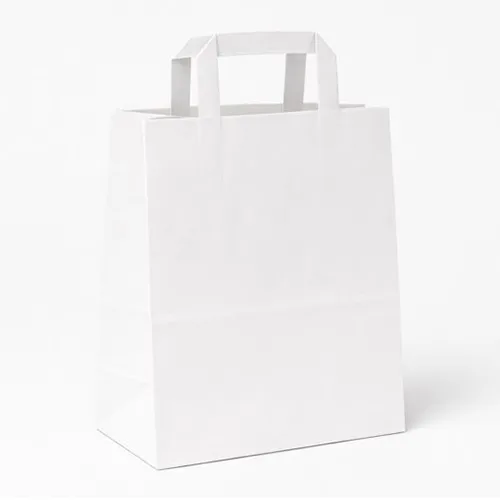 Made from sturdy white paper with an SOS (Self-Opening Sack) design, these bags open easily and stand upright for fast, efficient packing. The reinforced base and sides provide added strength, while the integrated handles ensure secure and comfortable carrying for customers.